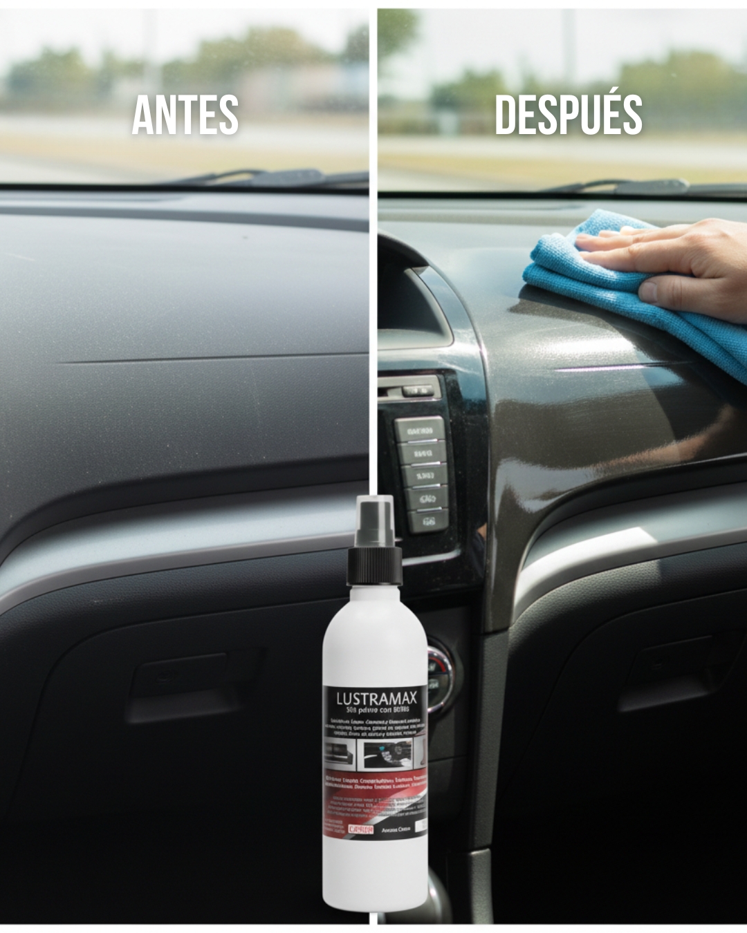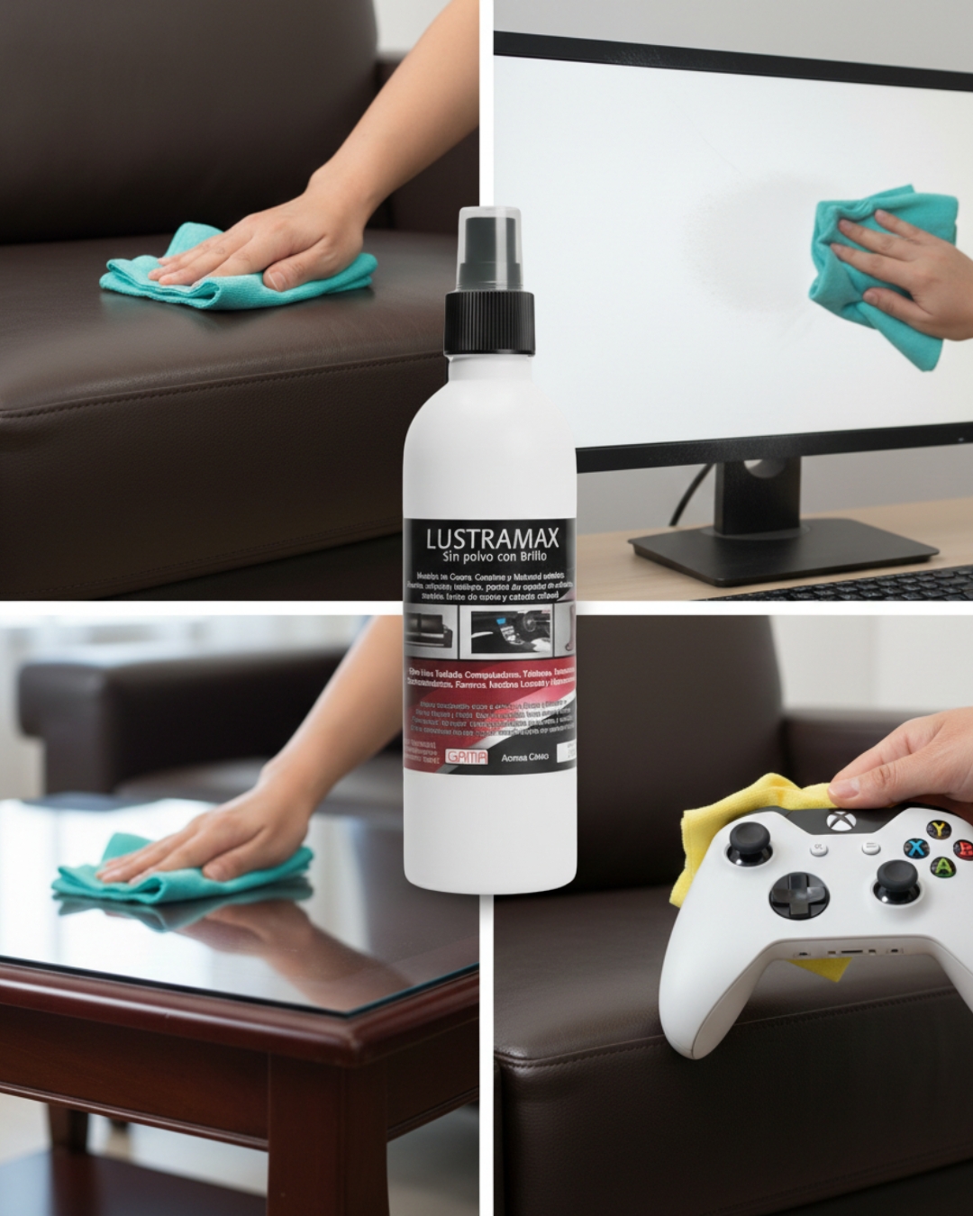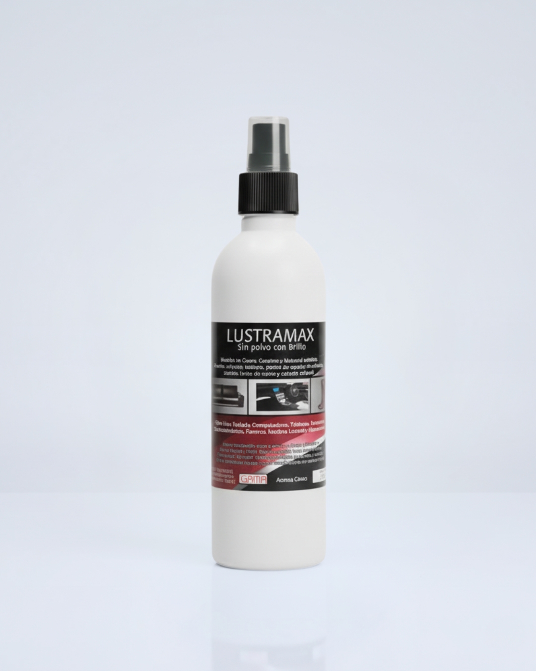 Lustramax es un limpiador multiusos y lustrador que deja brillantes los artículos que se limpien. Se puede usar sobre cuero, cuero sintético, madera lacada, paneles, llantas y tableros de vehículos, fórmica y equipo de cómputo como teclados e impresoras.